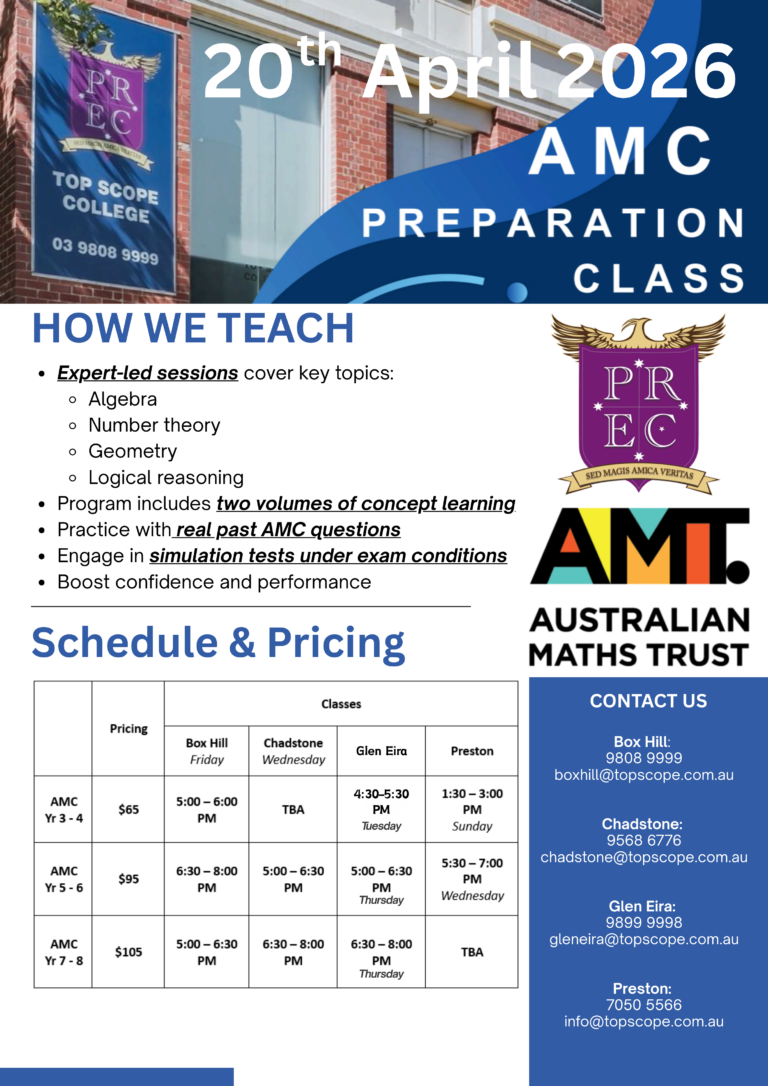 Unlock your full mathematical potential with Top Scope’s exceptional AMC (Australia Math Competition) classes. Our professional AMC tutor team, led by highly qualified teachers, offers a transformative learning experience through our Olympiad Maths training system. Tailored instruction empowers students to master mathematical concepts, hone problem-solving skills, and prepare for the AMC test, ensuring remarkable academic success.